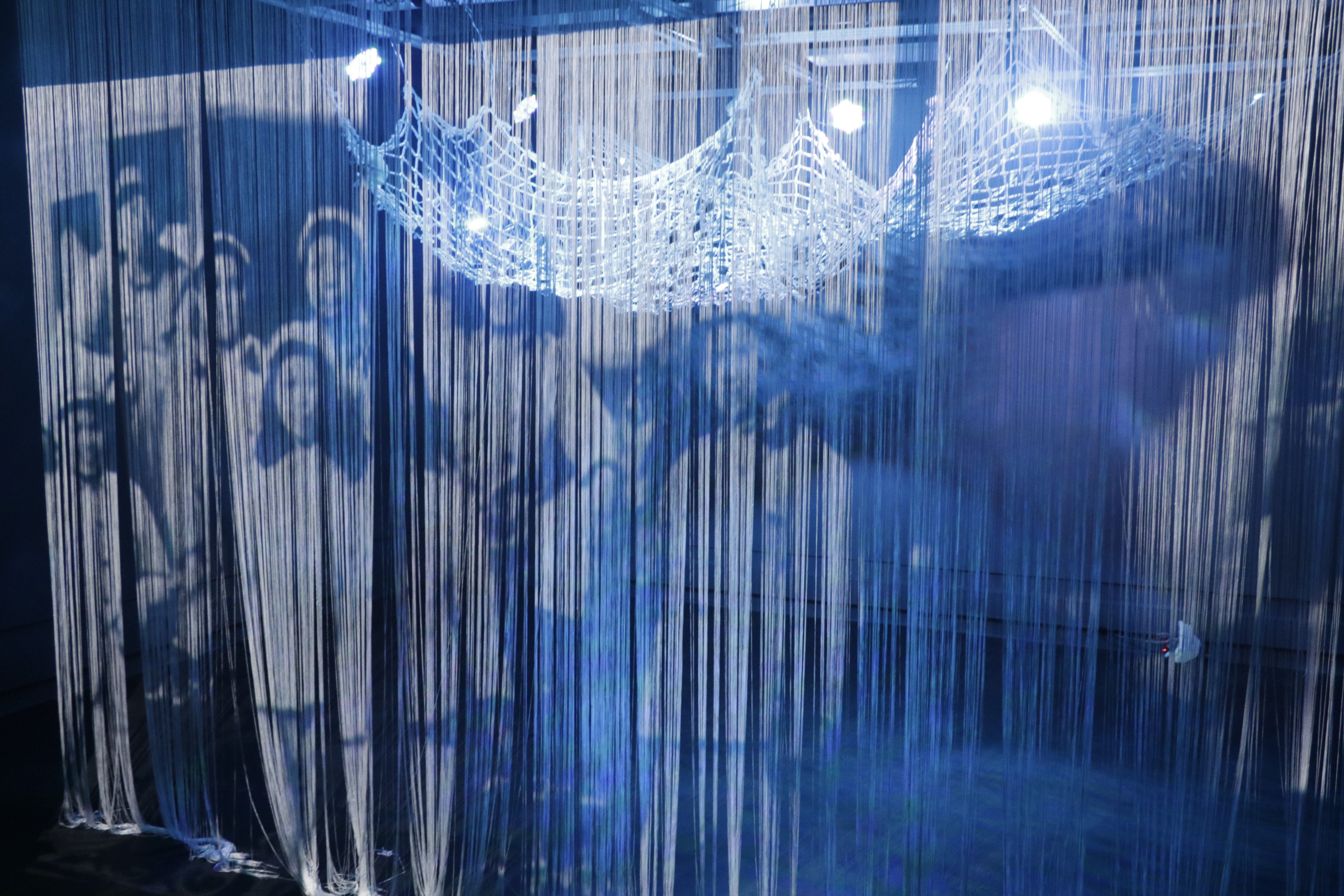 The net vibrates with layered sound from eight speakers surrounding and hovering the net: factory noise, model operas, slogans, and women’s voices. As viewers step into the structure, they become participants and witnesses of the memory from this piece of history. Through light, sound, and vibration, the work hints at stories that resonate beneath the surface.