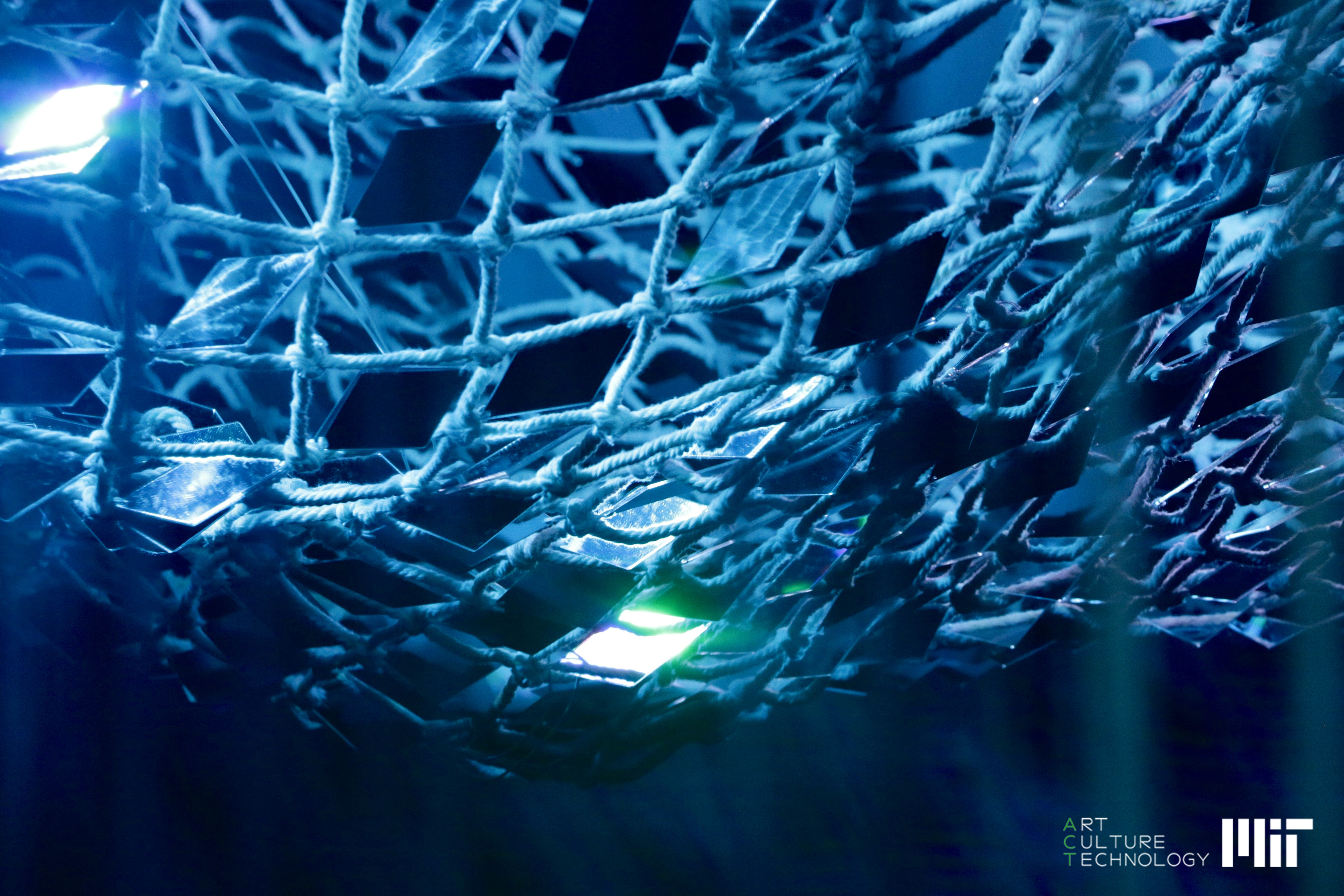 Fishing net structure, 3d-printed speakers, multichannel sound, mirrors, VR audio & video
