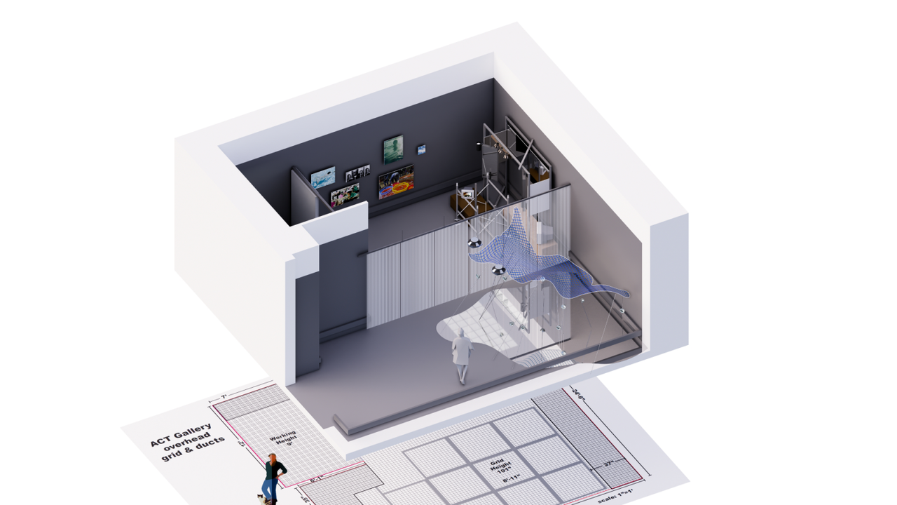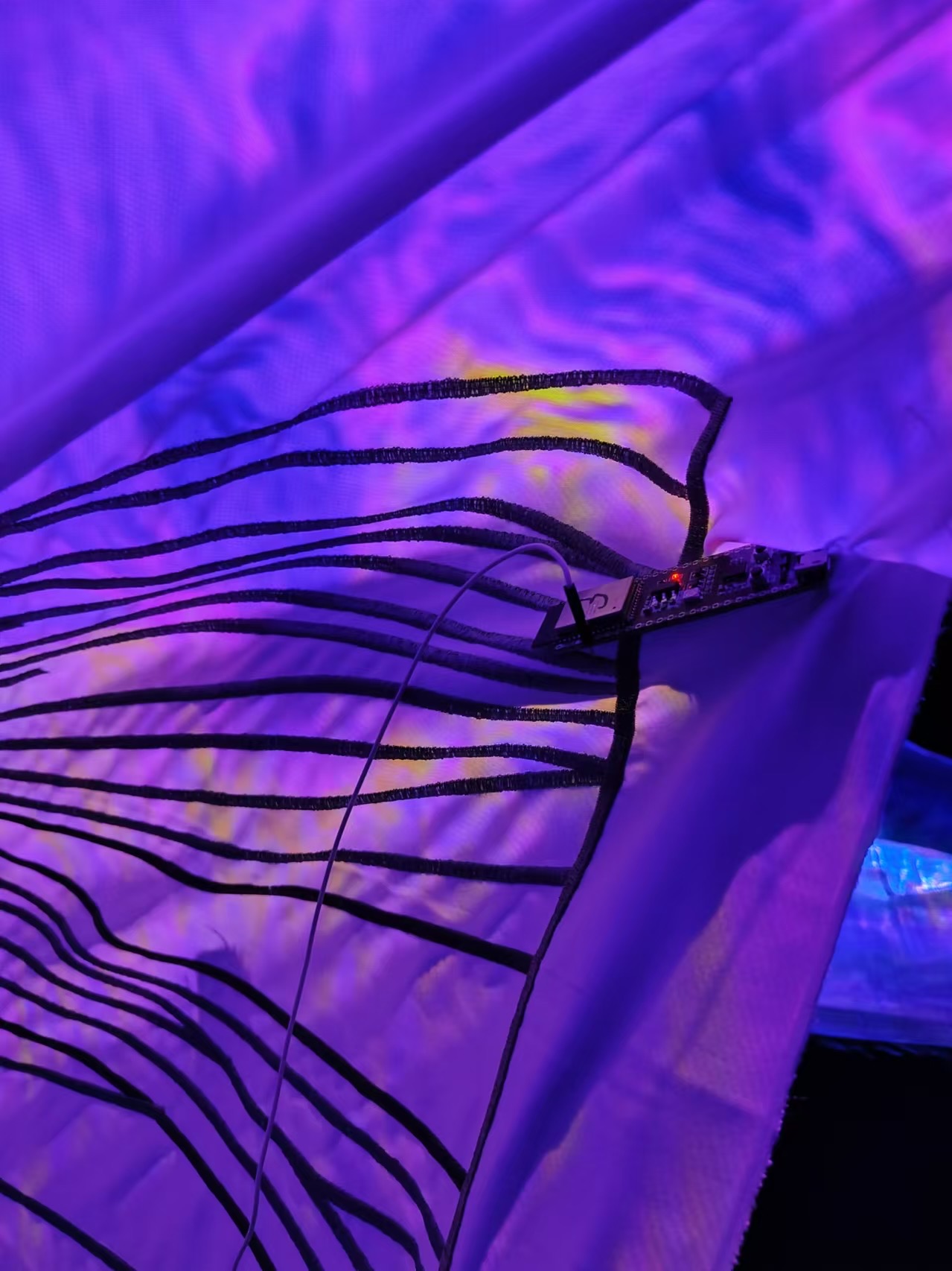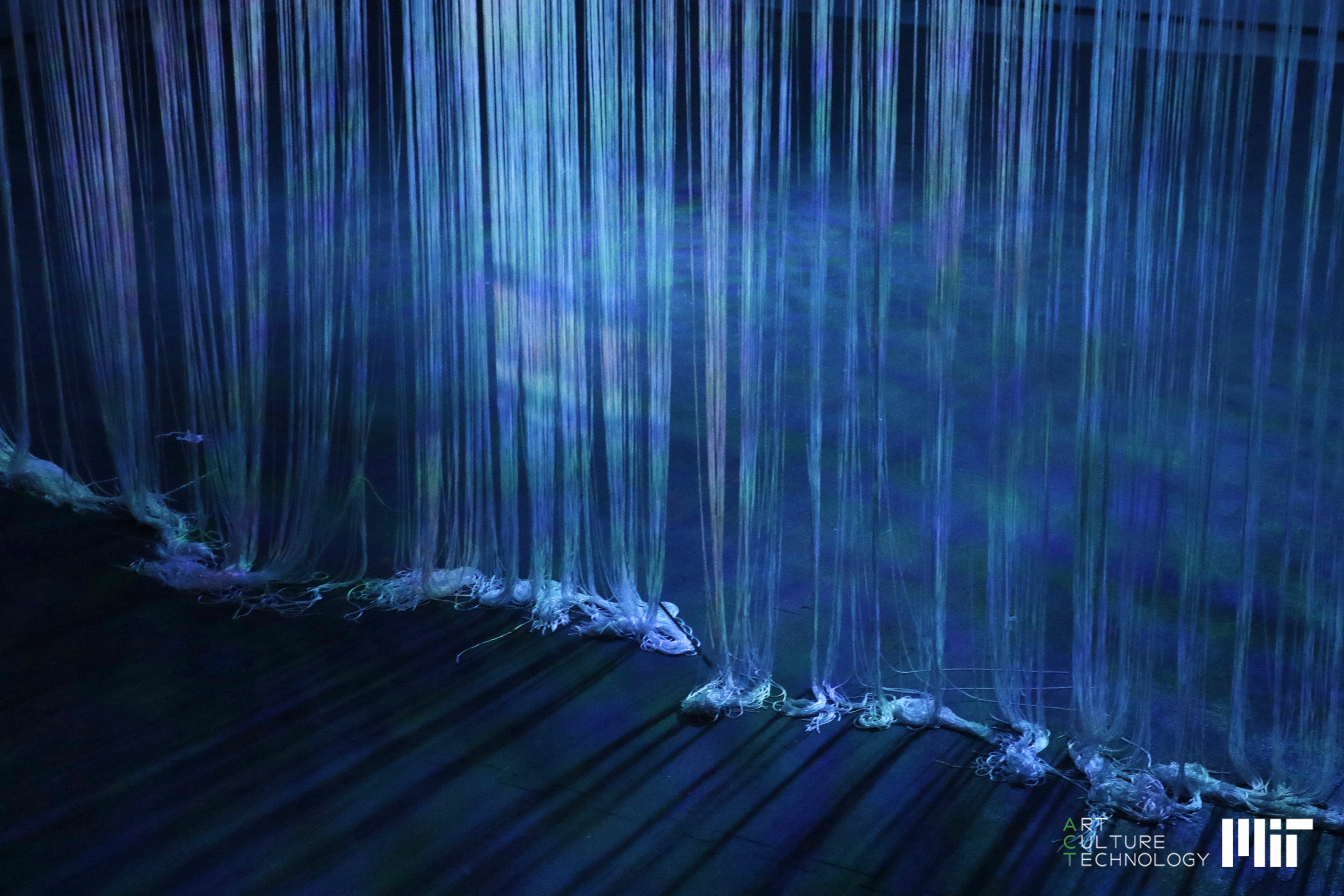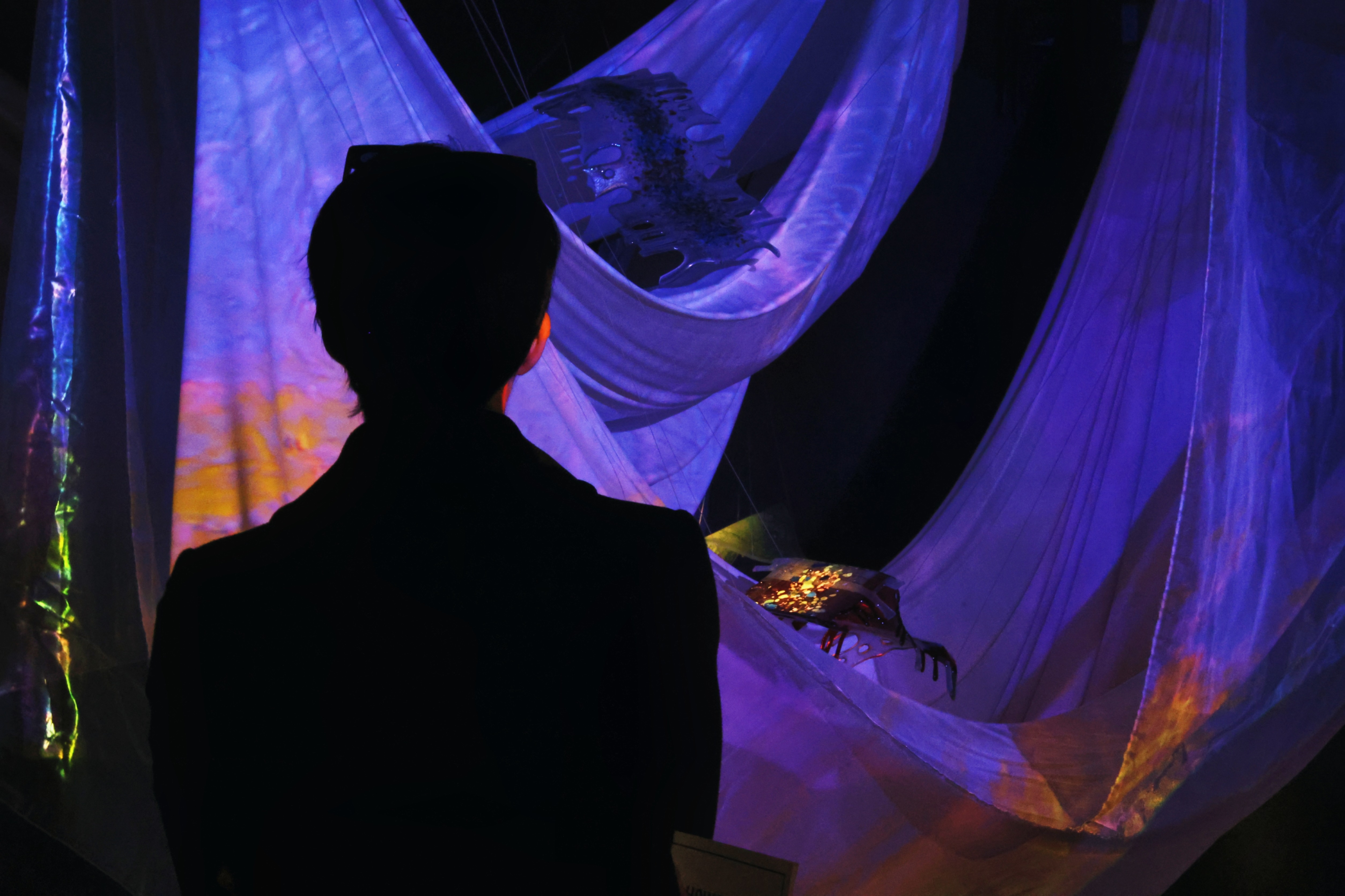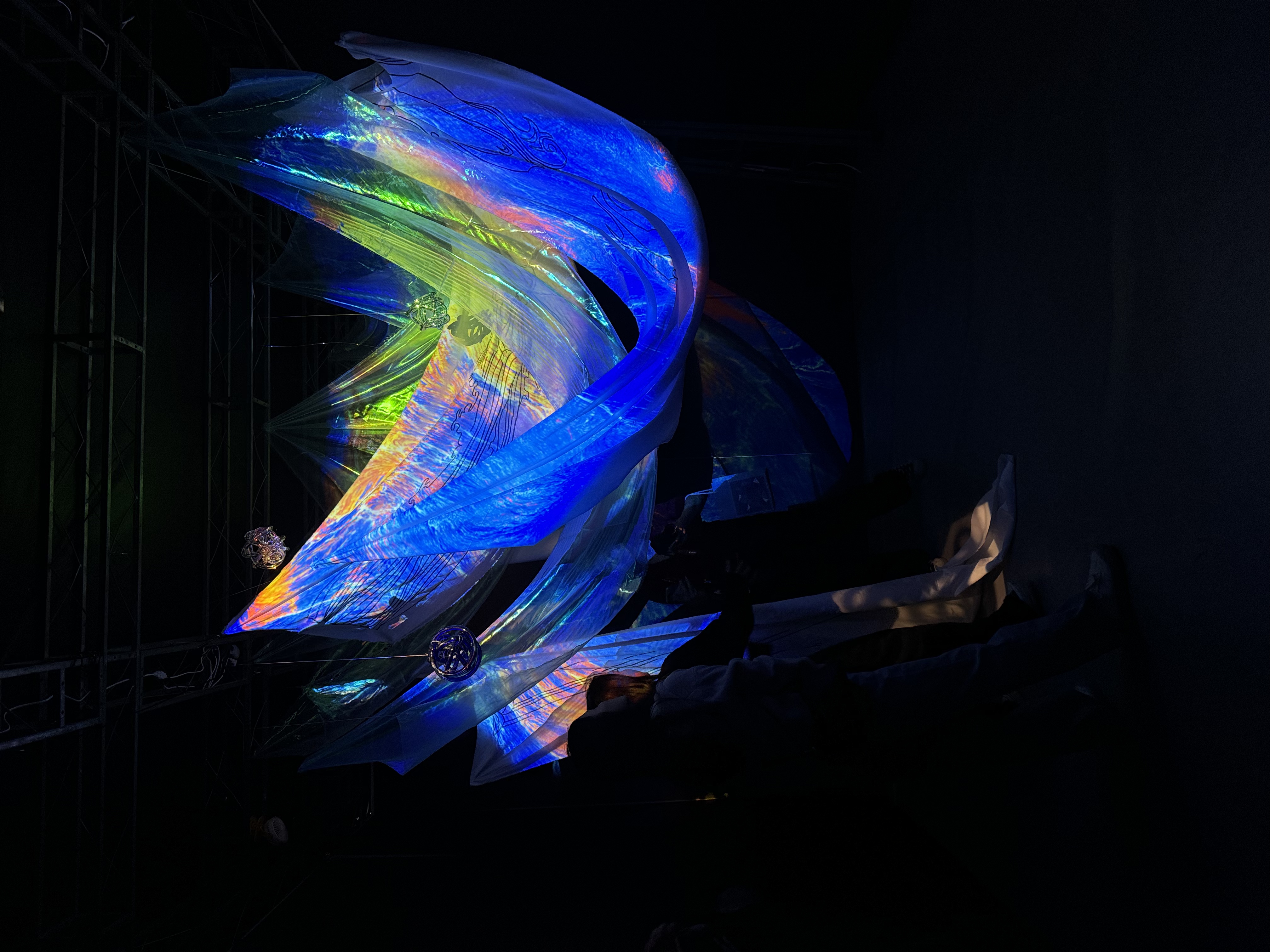 In Potus’ Echo, layers of gauze and flexible circuits form a suspended structure that carries flowing, data-driven visuals. These projections, which are generated from satellite imagery, hydrological data, and field recordings, move like water across the surface, shifting in color and texture as the data changes. Ambiance music which emphasizes found sounds accompanies the visual elements.