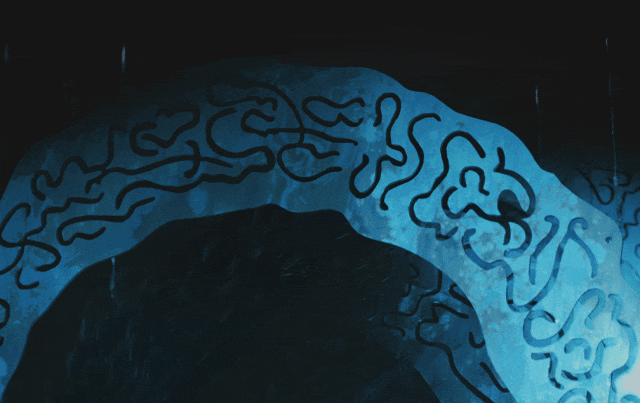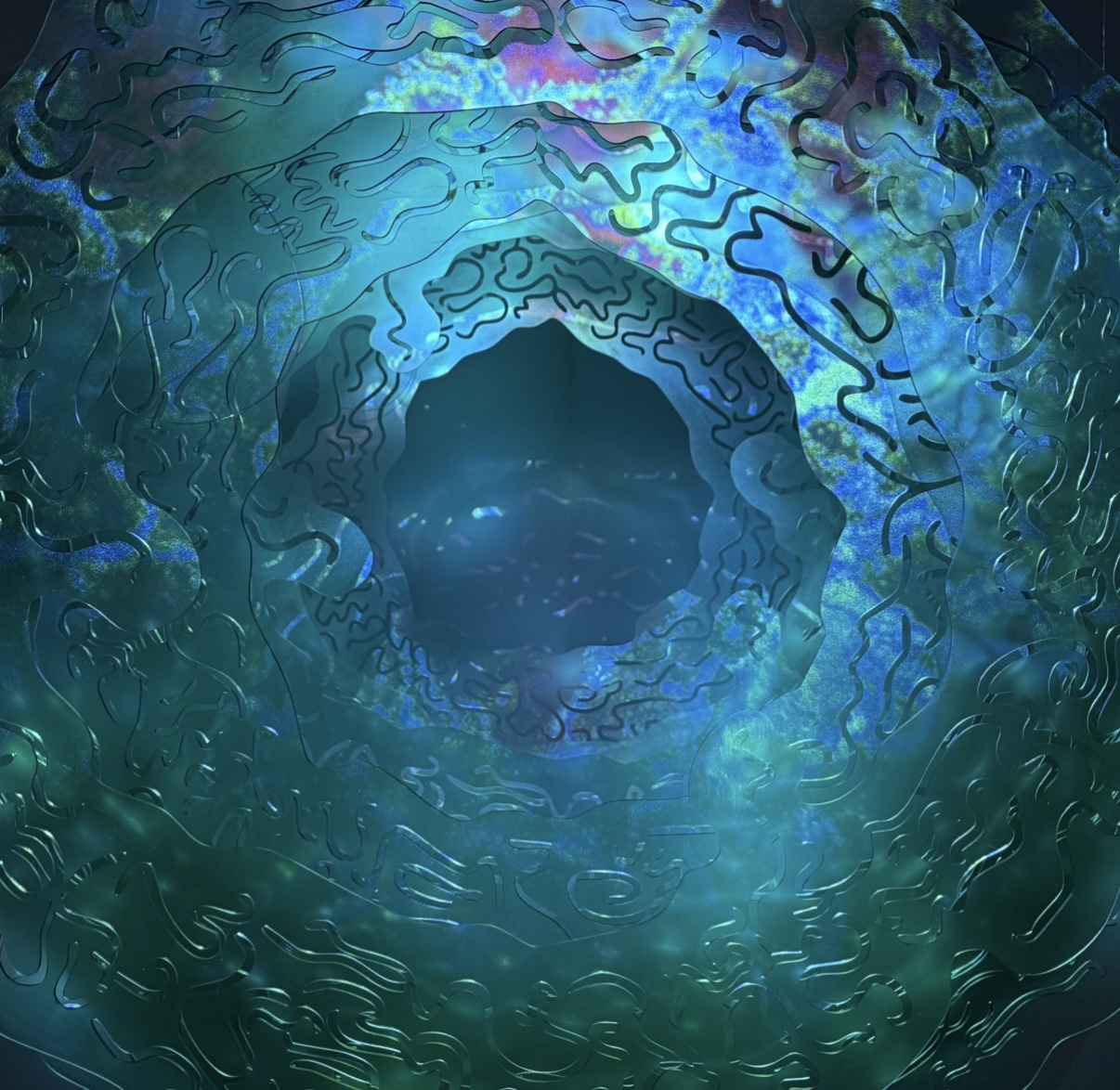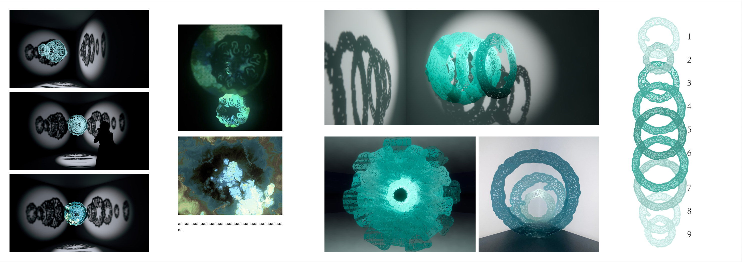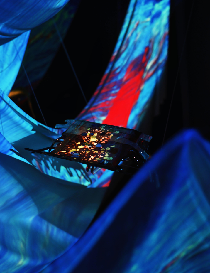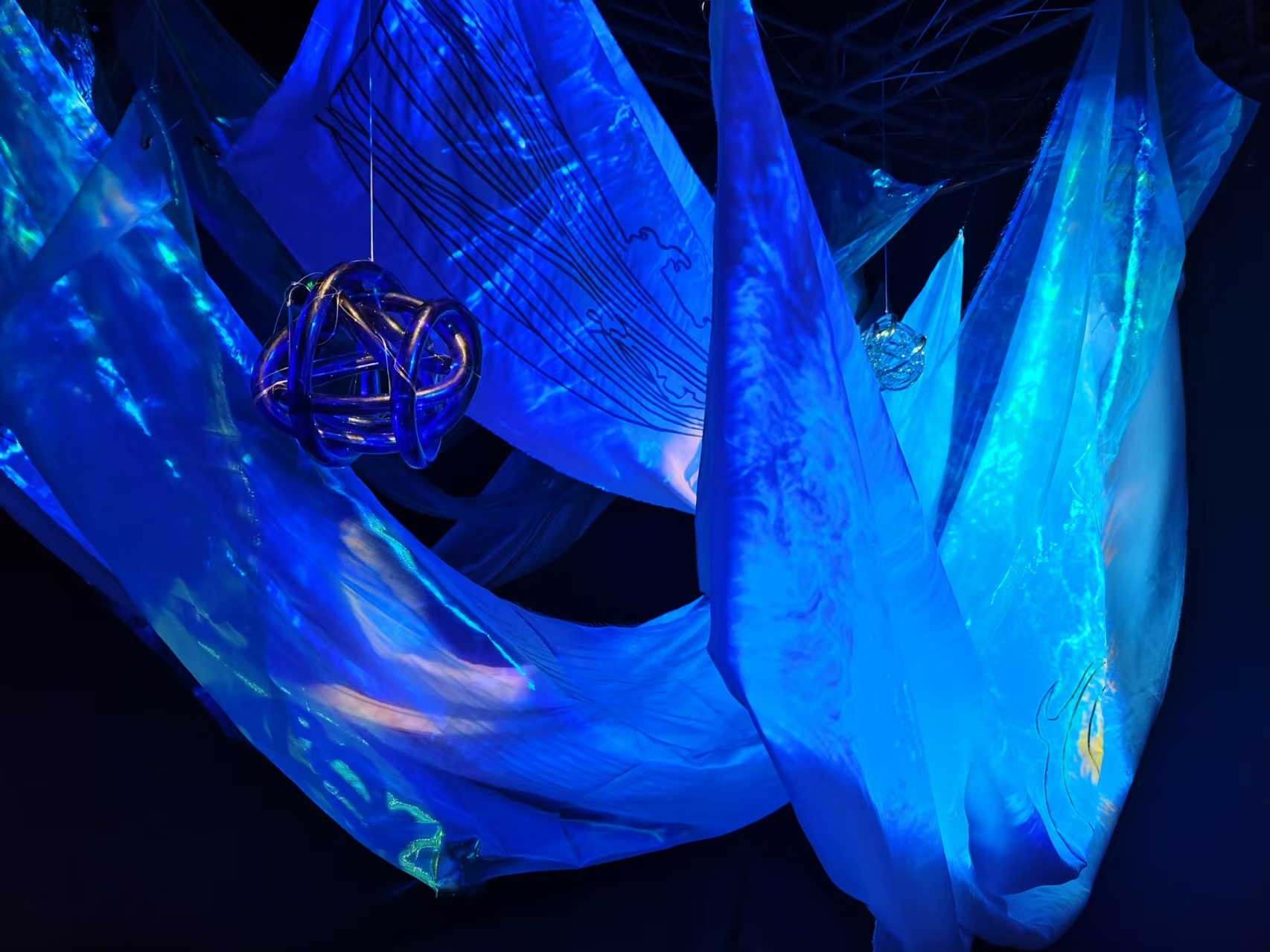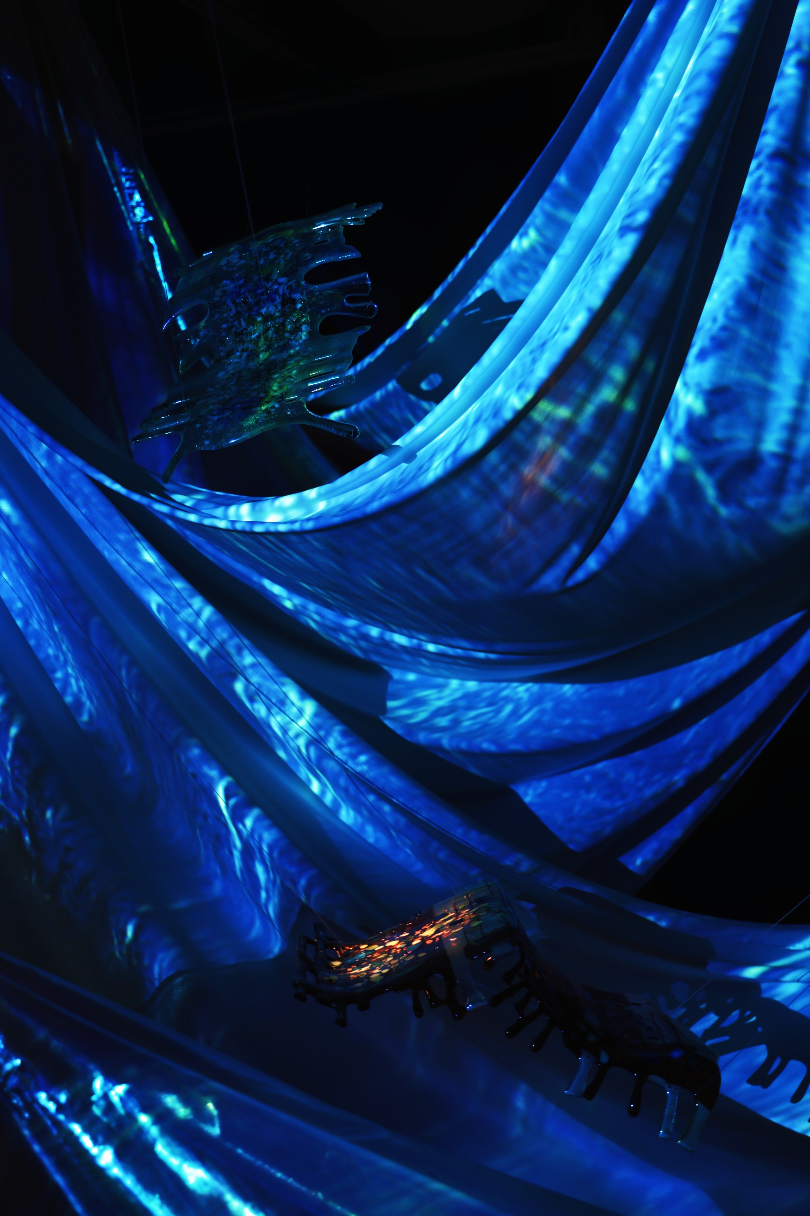 When viewers touch the gauze, the screens sway and distort, causing the projection to ripple and rotate in real time. Glass sculptures reminiscent of marine organisms hang within the piece, pointing to the intertwined relationships among humans, glassmaking, sand, and the ocean. These interactions encourage viewers to rethink their role within Earth’s unstable and interconnected systems.