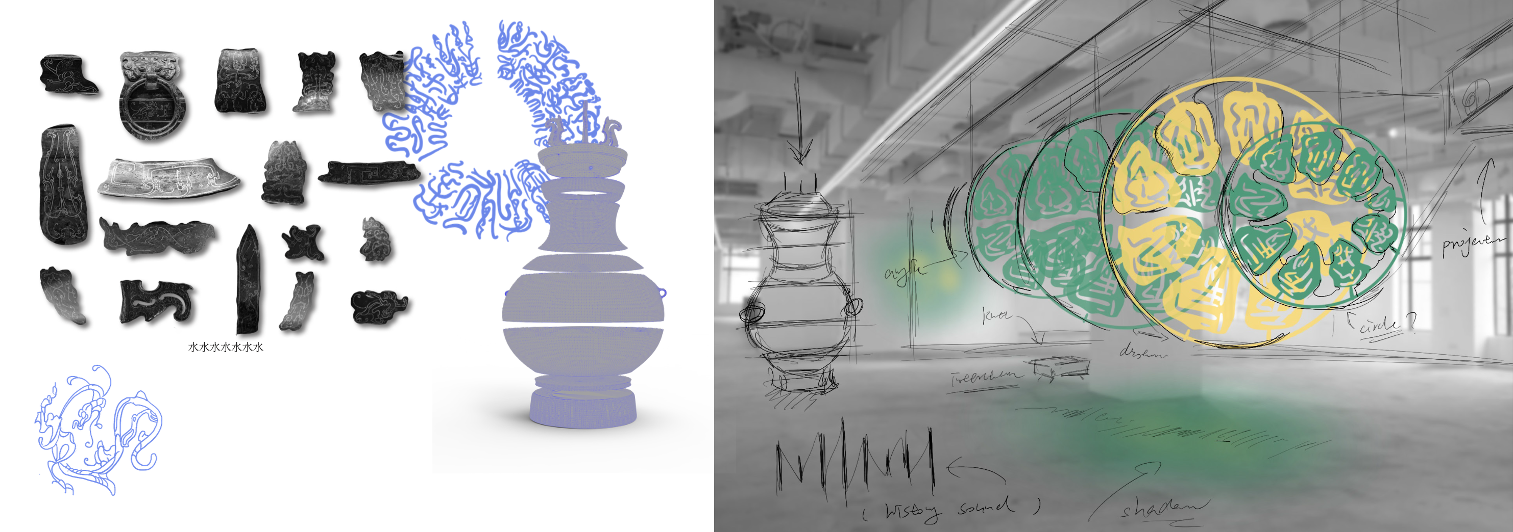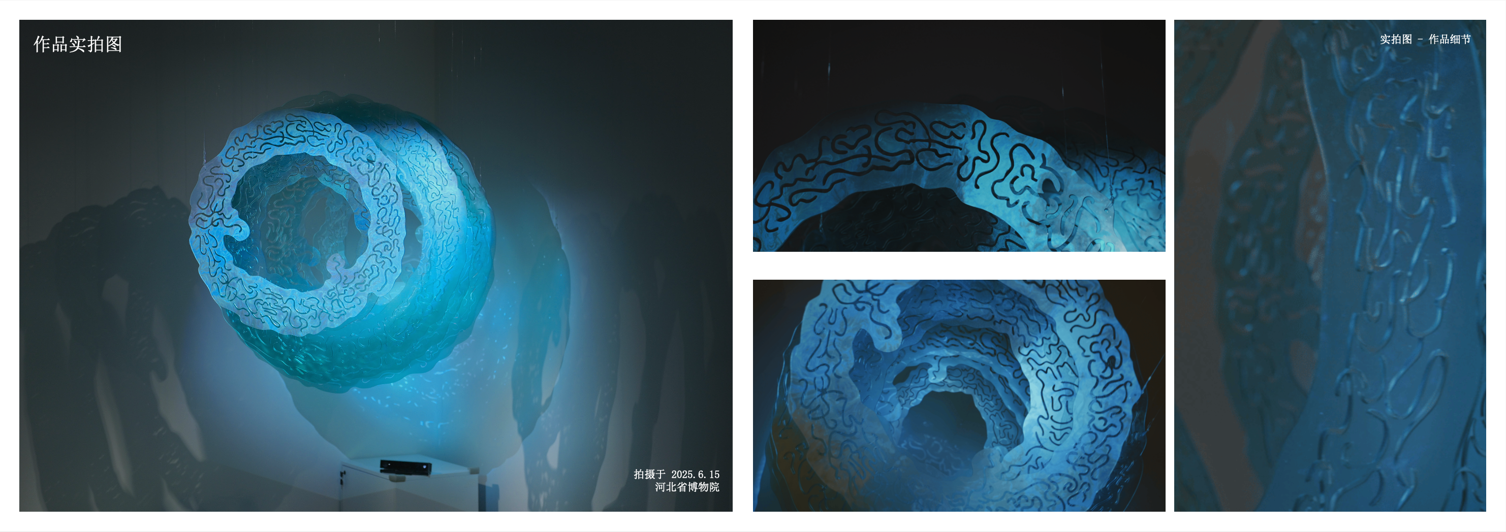 Commissioned by Hebei Provincial Museum, Where Light Ferments, Time Resounds reinterprets the ancient gilt-bronze vessel through nine stacked slices of bird-seal patterns. When viewers move their hands in front of the structure, a Kinect gesture sensor activates shifting projections and sound, briefly lighting up the carved motifs.