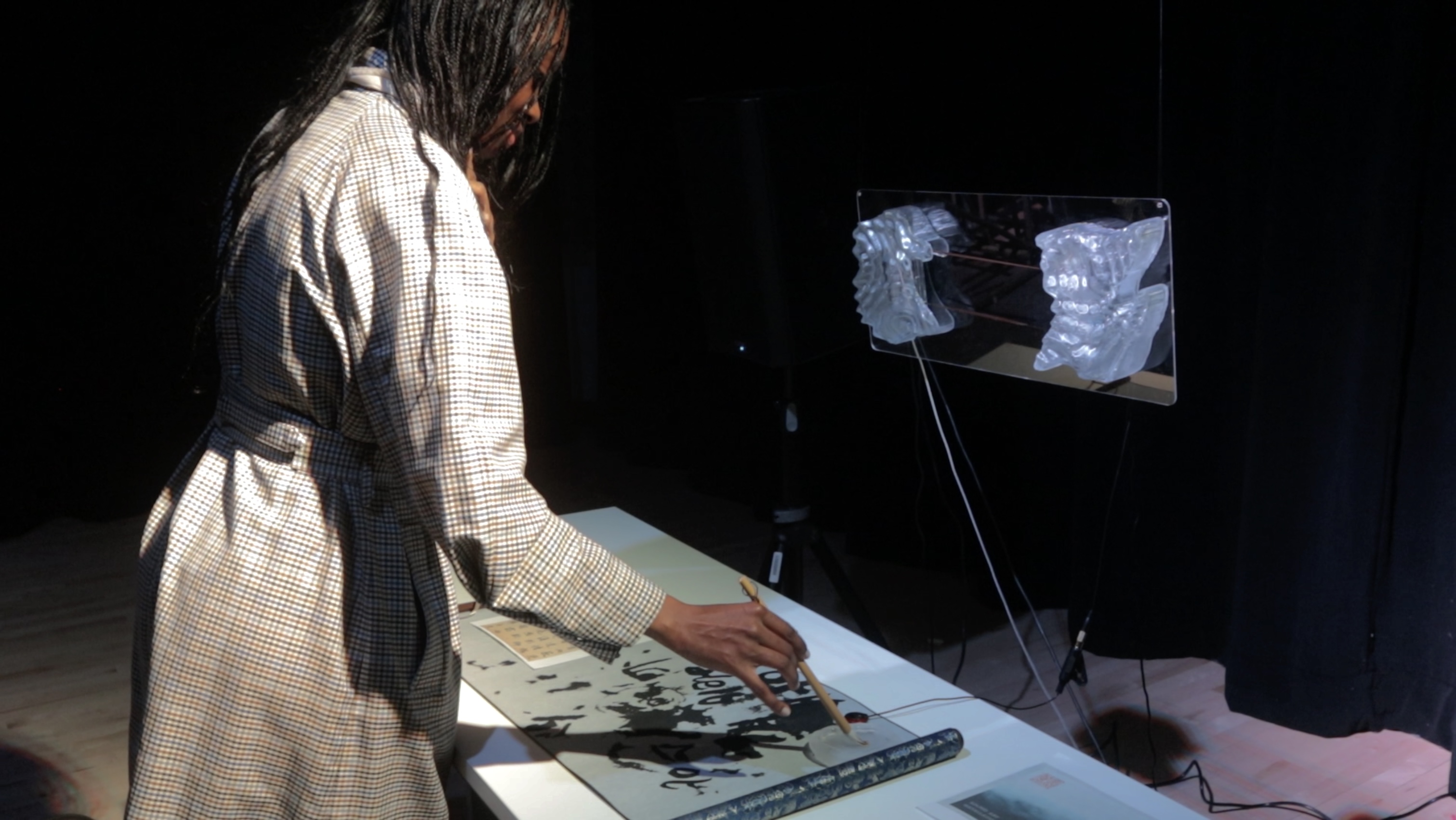 Dual-cassette loop system, calligraphy water mat & brush, contact microphone, magnetic tape, Max MSP patch