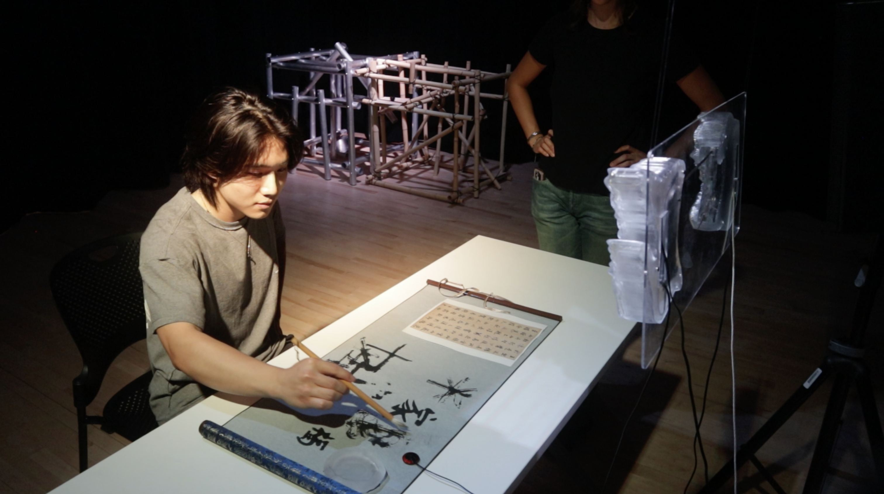 Stents is a sound sculpture that contains two cube structures, one made up of bamboo tubes and sheets, and the other with metal ones. Observed from the front, the bamboo structure writes out the Chinese character “家”, translating into “home”, while the metal structure draws out the shape of a house. This also ties to the materiality of calligraphy, where bamboo tubes are reminiscent of bamboo brushes while metal tubes are reminiscent of pens.