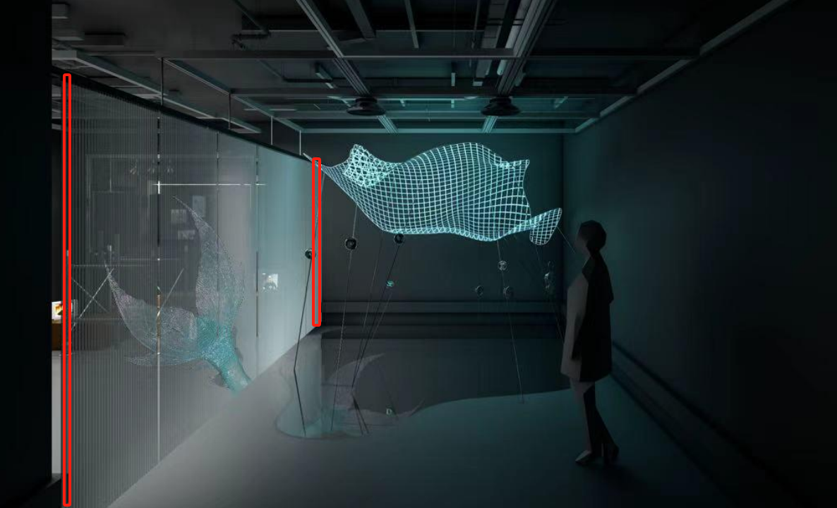 Interactive gauze-screen installation, flexible circuits, glass, projection system, ambiance music